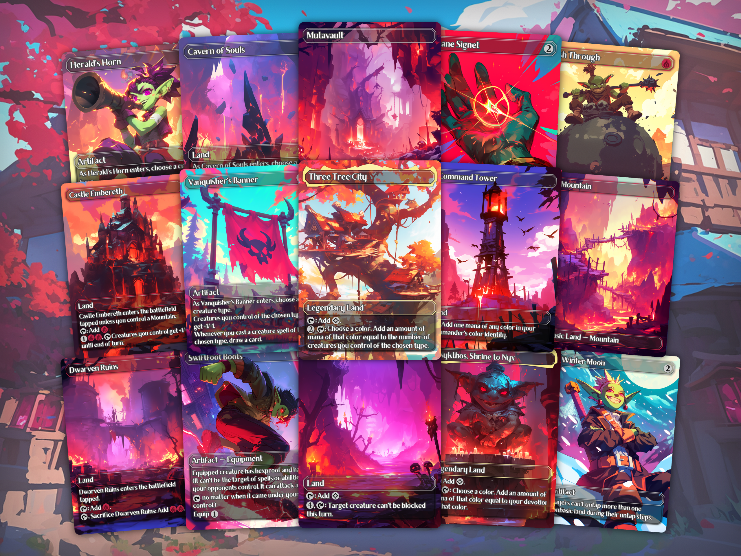 ★ What’s Included ★ – Complete 100-card EDH deck. – Borderless art double sided tokens included. – Consistent art style with dynamic frame breaks. – Printed on high quality black-core cardstock.